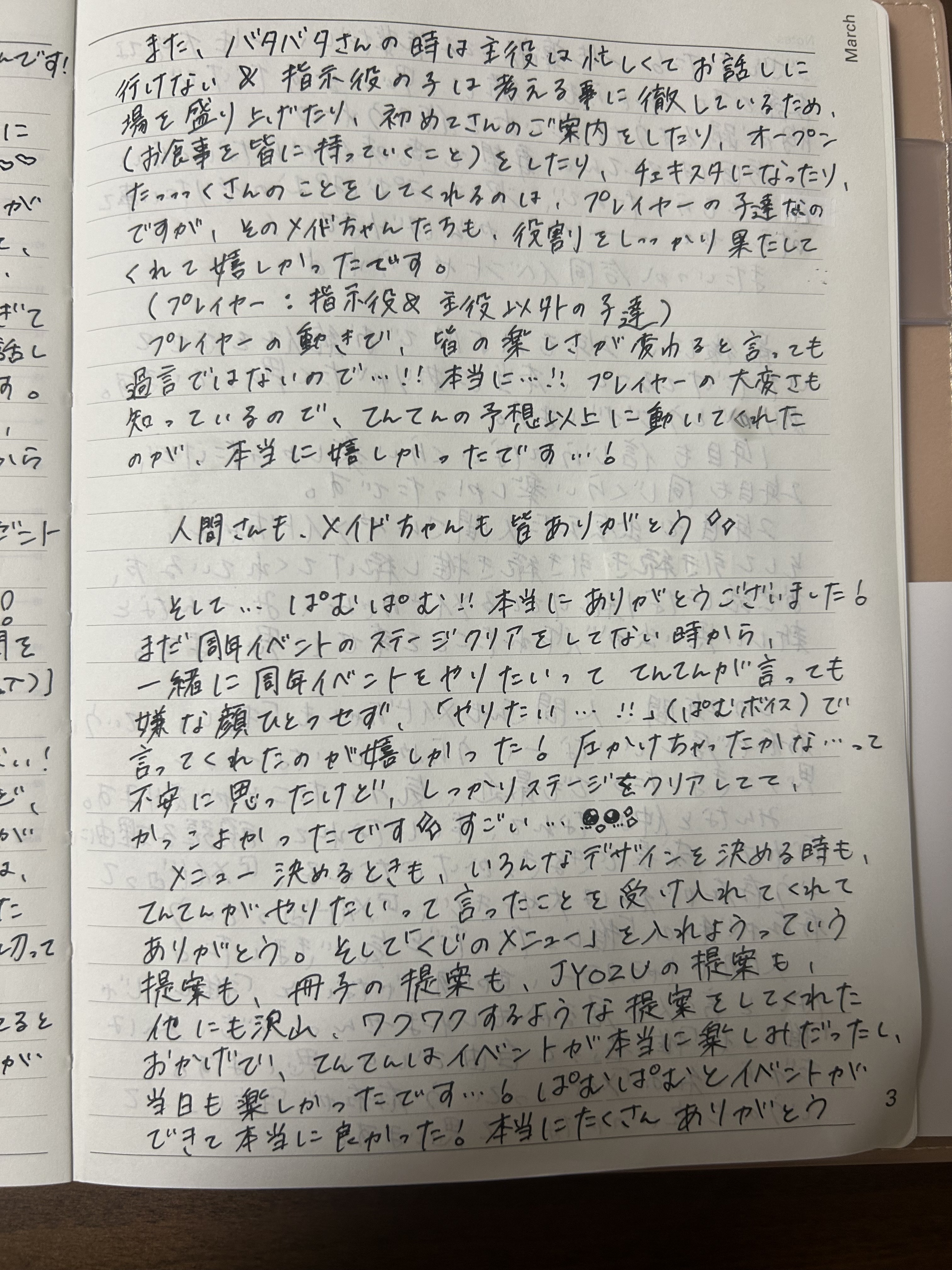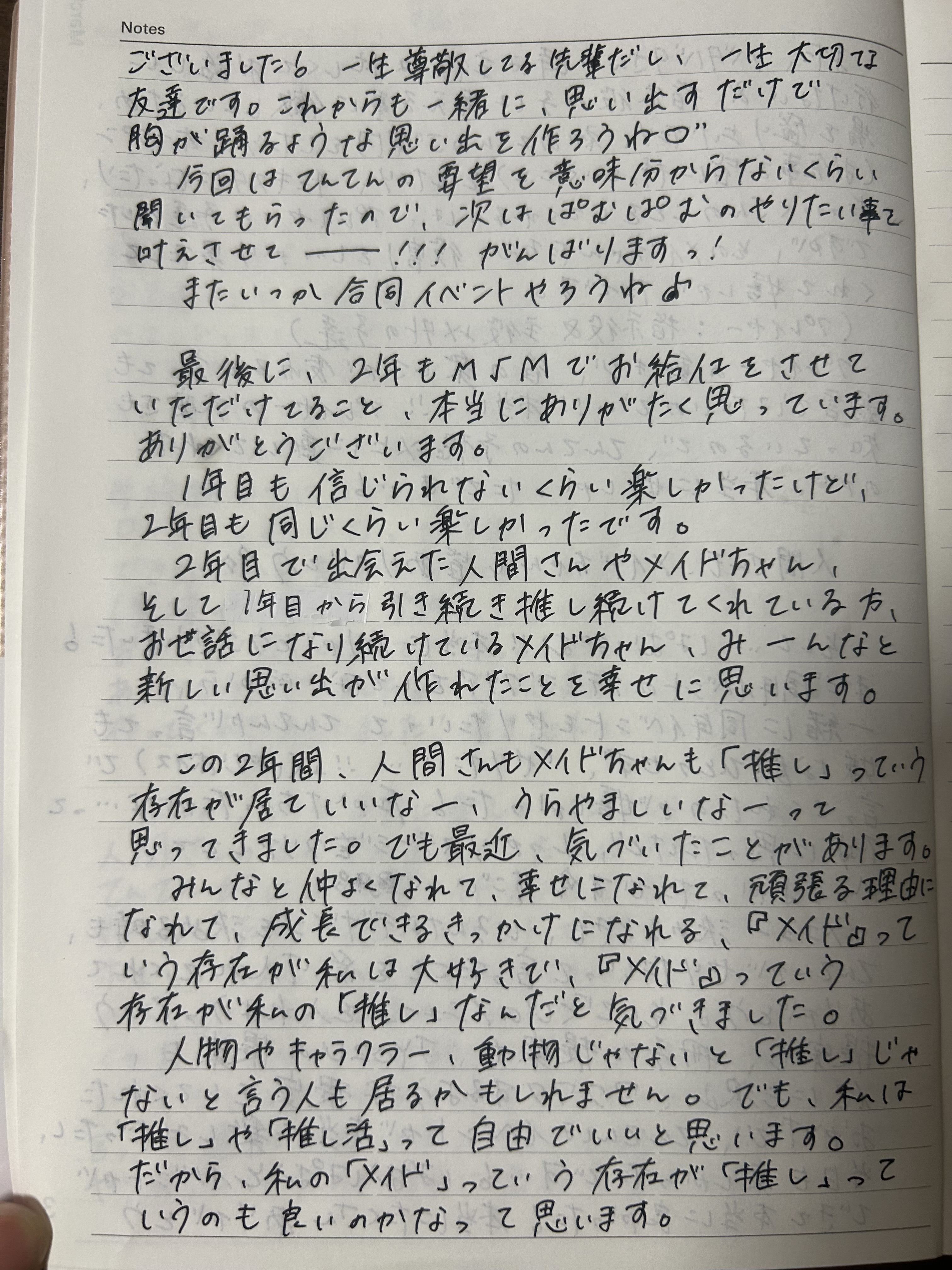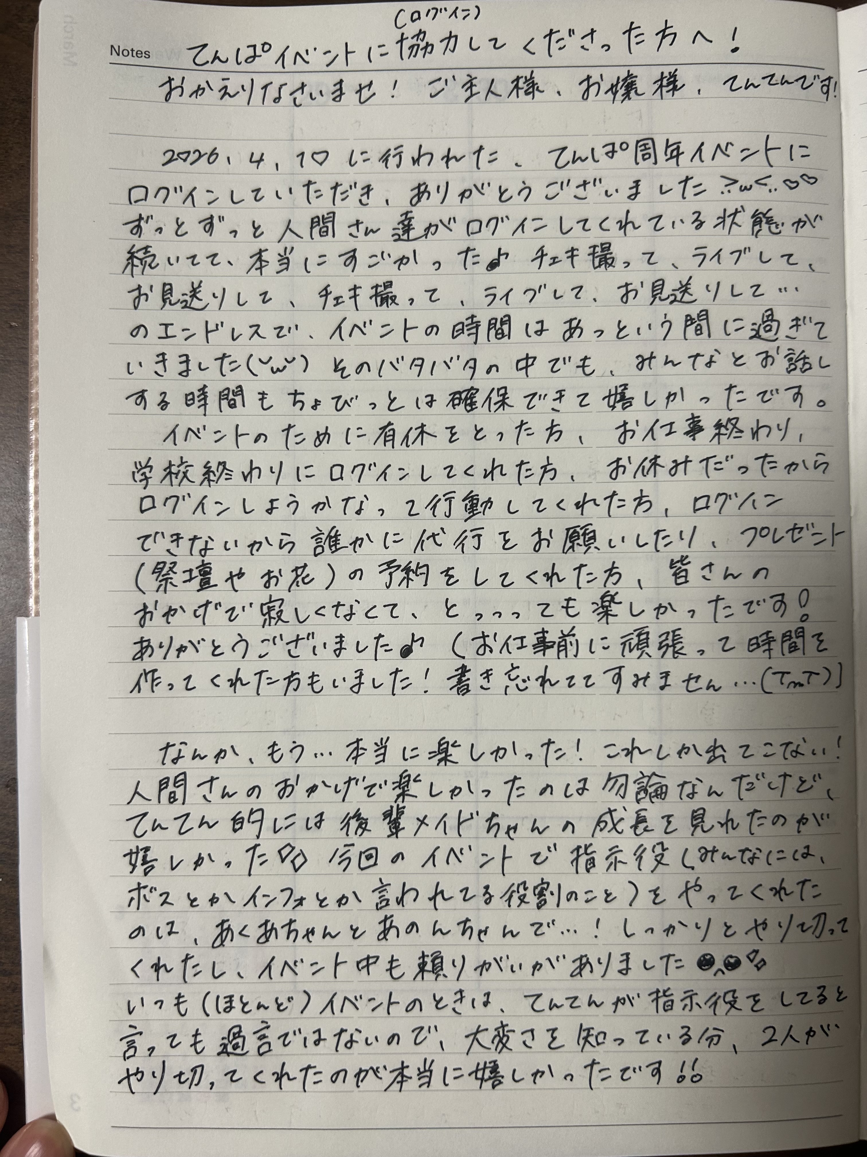 おかえりなさいませ♡ご主人様、お嬢様🎶♡てんてんです🥟❤︎.*今回は3月8日のてんてん2周年で祭壇をプレゼントしてくれた人間さん達へのお礼ブログになります!今回はメイドちゃん達が、誰がバッテリースティックをプレゼントしてくれたのかをメモしてくれていたので個人宛に少しだけお礼を載せたいと思います(՞ ᴗ ̫ ᴗ՞)まず、マジカルバッテリースティックをプレゼントしてくれた、・ぺえさん・だいきちまる・しょういちくん・みまにゃん・りょー(犬)くん・あおちゃん・ばたこくん・チームたまごっちの使者くん・ひーくん本当にありがとうございます🥹✨️みんなのおかげで、てんてんはキラキラステージに立てました❕てんてん一人で輝くことは出来ないけど、みんなのおかげでラストライブで輝けました❕❕❕✨️✨️「ラストライブ見れないけど…」「当日行けないけど…」って言いながらプレゼントしてくれた方もいて…!祭壇を見れないのにプレゼントしてくれてありがとう!1本でも多く祭壇を立てたいので、本当に嬉しかったです!(もし、バッテリースティックをプレゼントしたのに名前が無いなって方は教えてくださいт ̫ т💦本当に本当にすみません💦できれば本数も教えて頂きたいです💦)(名前なかったよーって方へ。プログラマーさんに予約者確認を再度して貰っています!!今回の祭壇に使用できてない可能性があるので、もし使用できてなかった場合、4/10のイベントで使わせて頂きたいですт ̫ т💦本当に申し訳ありません🙇♀️)(名前載せて欲しくないよって方も教えてください!後から編集で消せるので!!)ここからは1箱以上プレゼントして下さった方にお礼の文を200文字程度で綴らせて頂きます(՞ ᴗ ̫ ᴗ՞)♡本当にたくさん(8箱とか)プレゼントしてくださった方にはもう少し多くの文字で綴ります!(でも、1箱200文字では無いので、箱数×200文字という考え方は辞めてね^ ̫^)(200文字以上の方には文字数なんとなくで書いてます🥹)該当の方は読んでください♡*☼*―――――*☼*―――――🥟ぺえさんへ🥟祭壇たくさんありがとう!今回の祭壇が豪華になったのは、間違いなく!!!ぺえさんのおかげです!!こんなにバッテリースティックをプレゼントしてくれたご主人様はぺえさんが初めてです!嬉しい!ありがとう♡ぺえさんがてんてん推しって言ってくれてるのも嬉しいし、そんな中でてんてん以外の子のチェキをゲットしてくれたり、他の子にもバルーンアーチをプレゼントしてくれること、とっても誇らしいです✨️もちろん、てんてんにバルーンアーチやバッテリースティックをプレゼントしてくれることも嬉しいです❕個人的にそれが1番嬉しい❕やっぱり、プレゼントがあると、本当に自分のことを推してくれてるんだなって実感するので♡ただ、ぺえさんは頼まれたら大体のことをOKしてくれるので、少しだけ心配です‼️ぺえさんは大人だから、断る時は断ると思っています‼️‼️が‼️でも心配‼️今回もバルーンアーチをプレゼントするか悩んでたしね笑 大人だからこそ、てんてんの予想以上のことをしてくれると思ってますし、自分のキャパを把握してるとは信じてますよ。でも心配しちゃうことも許してね🥺これからもよろしくお願いします🎶👓だいきちまるへ👓当日行けないかもしれないって祭壇の予約してくれたのとっても嬉しかった!しかも当日ちゃんと来てくれて🎶もっと嬉しかったなー!!だいきちまるは、てんてんの大切な日を一緒に大切にしてくれるし、いつも前のめりにお話しをしてくれるので、普段からてんてんを大切にしてくれてるのを感じます。いつもたくさんお話してくれてありがとう!プレートも欠かさずプレゼントしてくれてありがとう🌟天邪鬼でツンデレなだいきちまるのこと、これからも大切にさせてね!🥟しょういちくんへ🦕ライブもプレートもチェキも祭壇も全部ありがとう!とっても嬉しかった!CPUの日も新制服お披露目の日も2周年の日もぜーーーんぶ当日に居てくれたの、本当に心強かったよ🌟⋆꙳いつもログインしてくれた時、てんてんドリンクを飲んでくれたり、ライブやチェキをてんてんにしてくれたり…てんてんのを何かをオーダーしてくれてありがとう🥹そのおかげで、しょういちくんに推してもらえてるって自信をもって皆に伝えれる🎶自信をくれることに一番感謝してます♡ありがとう✨️🥟みまにゃんへ🥟てんてんって転送初期は昼ロしか居なかったって言っても過言じゃなくて、みまにゃんと出会った頃は夜ロのお給仕、毎回少し緊張してたんだよね。あの頃、昼ロは会いに来てくれる人間さんは多かったけど、夜ロの時に来てくれる人間さんってとっても少なくて…。でも、みまにゃんと出会って、夜ロでみまにゃんと会えるようになってから、夜ロのお給仕が毎回楽しみになりました❕夜ロで自分の記念日があると、今でも結構怖いのですが、みまにゃんだけは来てくれるって信じれるから心強いです。いつ