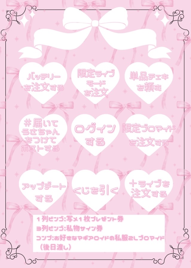 ルミナスは限定ドリンクについてるランダムトレカ、くじにある衣装チェキ帳、デカチェキ、ランチェキ、ハート型缶バ、で存在してます