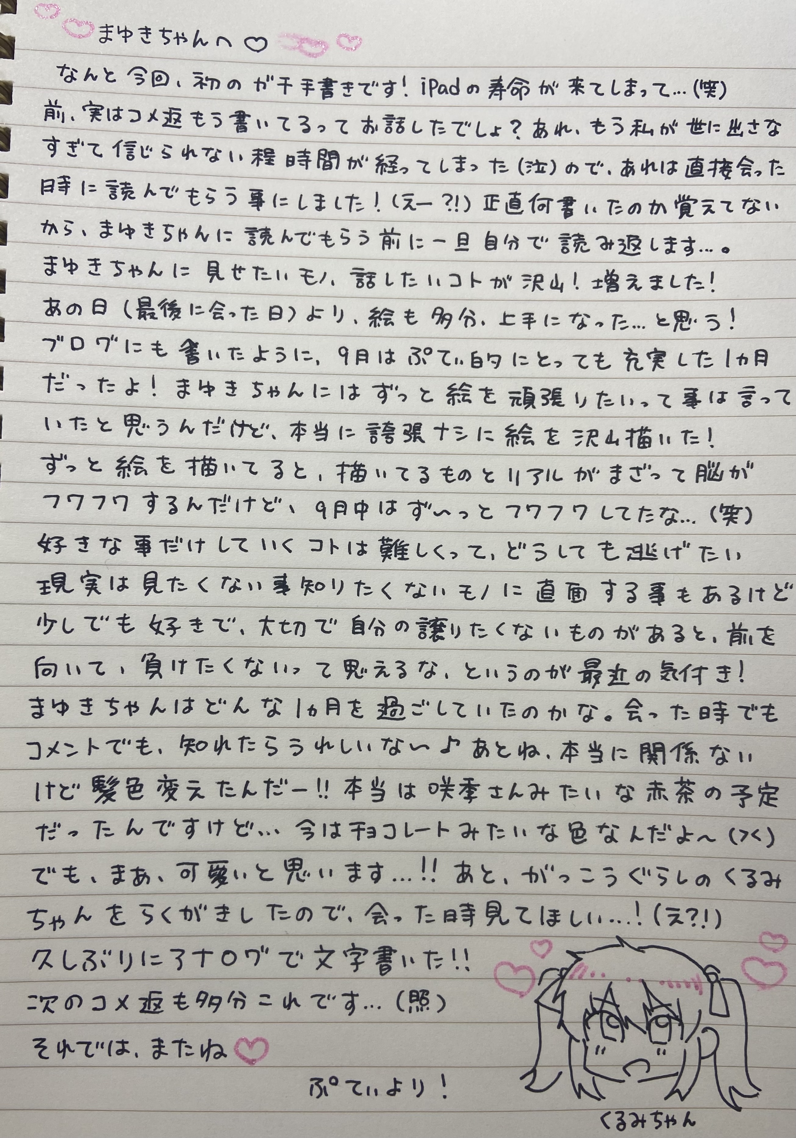 アナログのコメントもありがとう(T T)くるみちゃん本当に大好きだからぷてぃちゃんの描いた胡桃ちゃん見れて本当に幸せだし今日見せてくれたのもう1回見たい…!文字数が