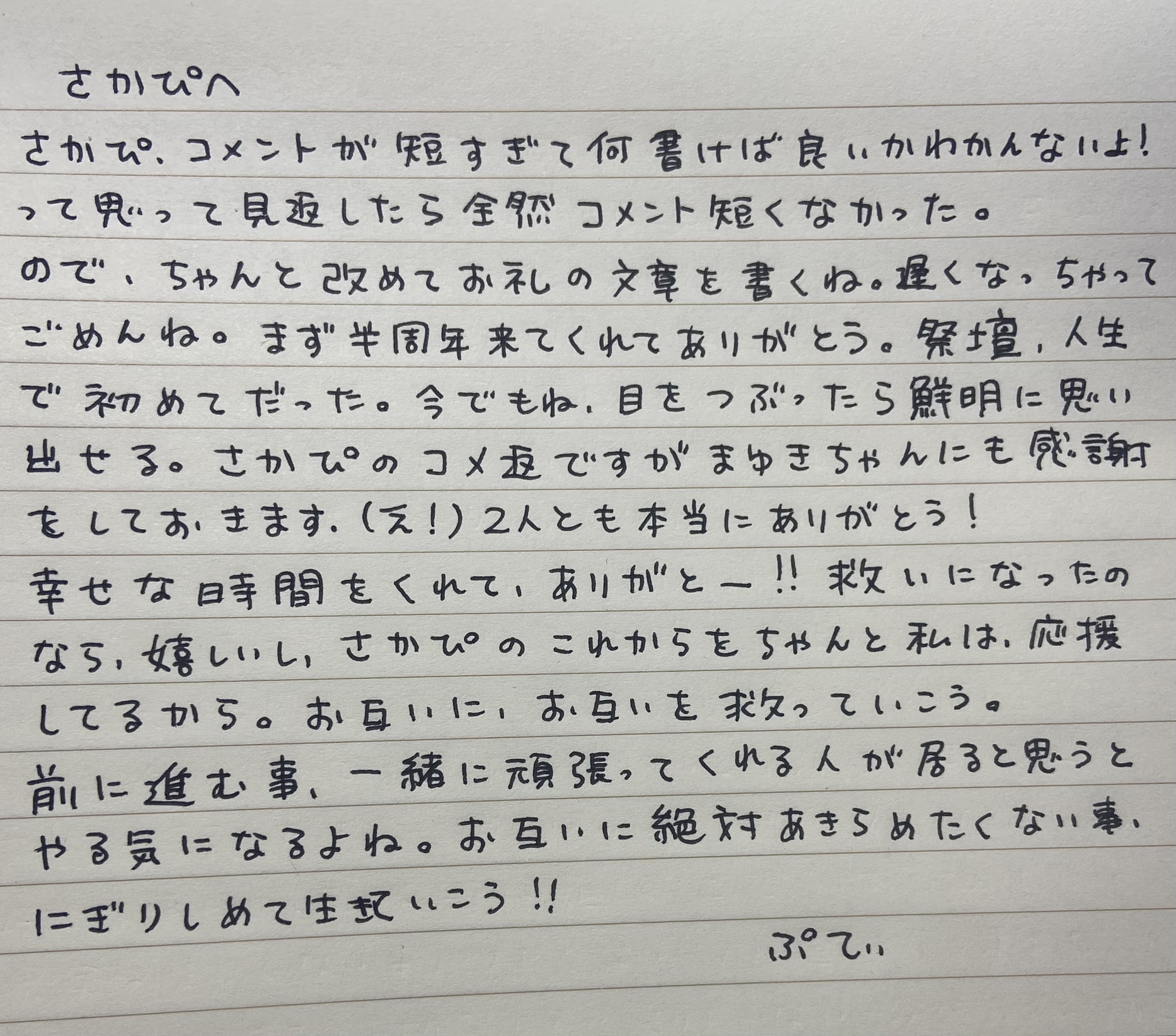 ここで2ヶ月経ってるのに半周年のお話なんですが、本当に私、半周年のあの日があったから、今も頑張れている部分があります。とっても。私は自分の意思や気持ちが凄く強いので、1人でも前に進む事はできるけどそれでも、誰かに好きだよって素敵だねって言われる事は物凄く活力になる。頑張る理由や意義を増やしてくれるみんなに、ありがとうって気持ちでいっぱいです。