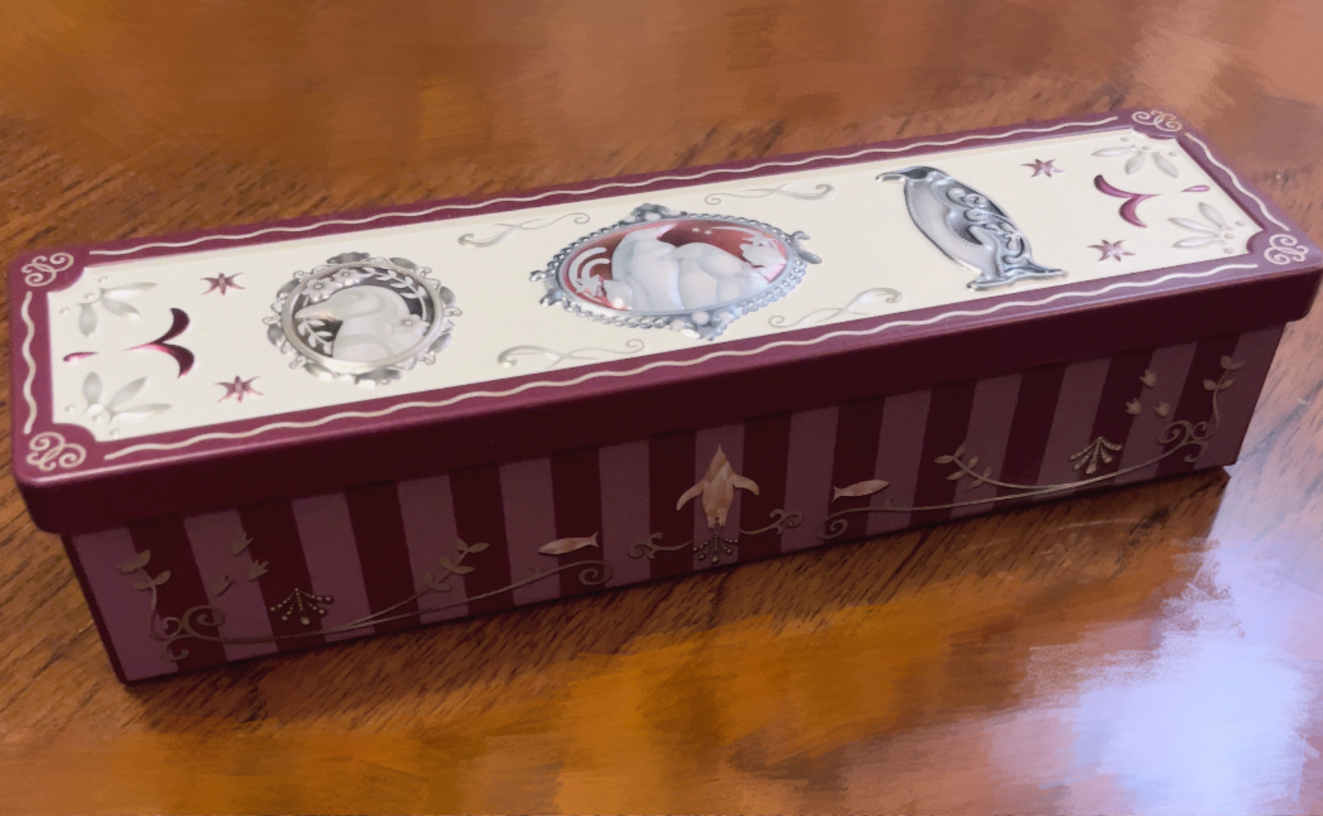 これは妹ロイドに頂きました!八景島シーパラダイスのお土産の缶です!確か中はペンギンのクッキーが入ってたと思います!めーーちゃかわいいくて驚きました!!ペンギンもリアルな感じなのにとってもオシャレで美術館の作品見たいです!!横の縦縞や模様もいい味出しています!なにより細長いのが面白いですよね。缶だとあんまり見かけないなと思います。これは液タブのペンやお気に入りのペンなどを入れようかなと思ってます!