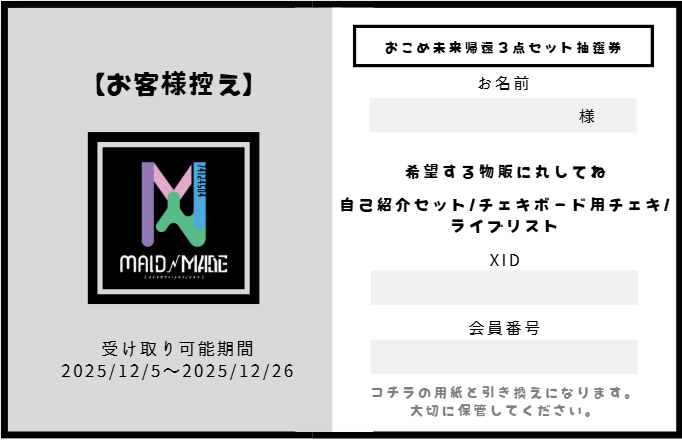 ・当選通知はX(旧twitter)のDMにて行います。メイドメイドの公式アカウントからのDMを受け取れるよう設定をお願いします。DMを送れない場合は当選無効となります。
