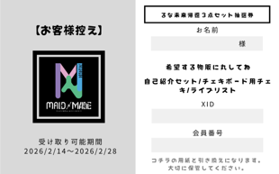 白い雪のプリンセス~鏡よ鏡、世界でいちばん美しいのは~ある日のとある星で雪のように白い肌、花のように赤い唇、白鳥のように美しい娘が生まれました。その子の名前は、かなう姫___かなう姫は継母の女王と共にお城で暮らしておりました。継母は毎日鏡にこう唱えるのです。「鏡よ鏡、この世で一番美しいのはだぁれ?」この物語の続きは皆さんで体験してみてください💭...日時:2026年4月10日(金) 12:00-22:00🍎当日衣装:白雪姫(かなうのみ)🍎当日物販🍎🪞once upon a time ¥4,450(税込 ¥4,895)・イベント限定ドリンク・好きなメイドさんのライブ・ランダムトレカ 2枚(かなうA、かなうB、つむぎ×うさ、きら×こちゃ、ルミナス×このえ、たぴる×めもり、なな×かなう)🪞君がくれる目覚め ¥2,800(税込 ¥3,080)・かなう衣装アクスタ🪞君との1ページ ¥1,760(税込 ¥1,936)・複製サイン&メッセ付きかなう衣装ブロマイド・かなう衣装ブロマイド✨レアあり✨レアには直筆サイン付!🪞かなうと紡ぐ物語 ¥4,900(税込 5,390)・かなうブロマイド帳🪞美味しいリンゴはいかが? ¥1,300(税込 ¥1,430)・かなう姫の大好物!タルトタタン風タルト毒入りなら大当たり🍎✨特典:好きなキャストの白雪姫衣装2Lブロマイド※後日渡し🪞君が始める物語 ¥900(税込 ¥990)・くじ※1ターンに付き上限5回までA賞:選べる!衣装アクスタ 5本・好きなキャストの白雪姫衣装アクスタ※後日渡しB賞:かなう衣装アクキー 10本・かなうの白雪姫衣装アクキーC賞:かなう顔面アクキー 20本・かなうのお顔のみのアクキーD賞:ミニミラー 10本・かなうイベント限定ミニミラーE賞:限定フレーム付き衣装ブロマイド 30本・かなうイベント限定フレーム付きL判ブロマイドラインナップかなう、うさ、つむぎ、こちゃ、このえ、なな、ルミナス、きら、たぴる、めもり、ぽめち、ひなの、くまこ、たまて、エリスF賞:証明写真ブロマイド 48本・かなうとみんなの証明写真風L判ブロマイド※ランダムでのお渡しとなります。🪞衣装ブロマイド ¥700(税込 ¥770)・メイドさんの白雪姫衣装ブロマイド※かなうの販売はありません🍎予約物販🍎🪞魔導人形設計図(小) ¥19,100(税込¥21,010)・衣装タペストリー 小・予約受付期限:当日まで・ひとことメッセージ付き・ポーズ指定可・シングルコアリィ以上のマギアロイド対象🪞魔導人形設計図(中) ¥35,100(税込¥38,610)・衣装タペストリー 中・予約受付期限:当日まで・ひとことメッセージ付き・ポーズ指定可・MADEインストール率50%以上もしくは、クアッドコアリィ以上のマギアロイド対象🪞魔導人形設計図(大) ¥65,800(税込¥72,380)・衣装タペストリー 大・予約受付期限:当日まで・ひとことメッセージ付き・ポーズ指定可・MADEインストール率70%以上もしくは、ヘキサコアリィ以上のマギアロイド対象🪞スタンドフラワー ¥99,520(税込¥109,472)1段のスタフラ・予約受付締切:4月3日まで・簡単なイメージカラーの指定可能・スタンド上部の札にはお好きな文字が指定できます。🪞スタンドフラワープレミアム ¥170,000(税込¥187,000) 2段のスタフラ+オリジナルムービーを店内でスライドショー・予約受付締切:4月3日まで・簡単なイメージカラーの指定可能・スタンド上部の札にはお好きな文字が指定できます。・オリジナルムービーは店内モニターに1日上映し、後日データをお送りいたします。🪞等身大パネル メイド服ver¥57,500(税込¥63,250)イベント衣装ver¥59,100(税込¥65,010)・イベント当日に1日店内に飾ったあと、お持ち帰り可能です。・予約受付締切:3月27日まで・サイズ:幅600mm×高さ1,600mm・質感:スチレンボード(スタンドはダンボール製)・4つ折りでお持ち帰りいただけます。🪞シャンパンタワーGOLD 三角7段¥309,000(税込¥339,900)SP 丸型10段¥450,700(税込¥495,770)・予約受付締切:3月31日まで・簡単なイメージカラーの指定可能・1日中店内に飾った後、ご主人様お嬢様の希望時間にシャンパンを注ぐ儀式を行います。(特に指定がない場合は20時前後を予定しております。)