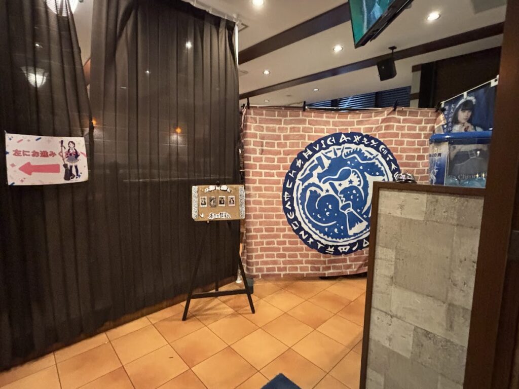 店頭に入るとキャストさんがお出迎えしてくれ、入り口付近で簡単にシステムの説明をしてくれました。アフィリア・クロニクルSでは、テーブル席と立ち飲み席があり、それぞれでチャージ料が異なります。(詳しくは費用・費用相場にて紹介します)