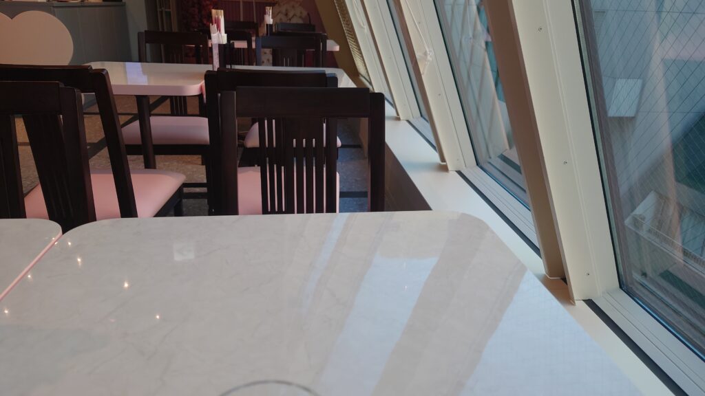 店内はピンクや白を基調とした可愛らしい空間で、複数のテーブル席が用意されています。