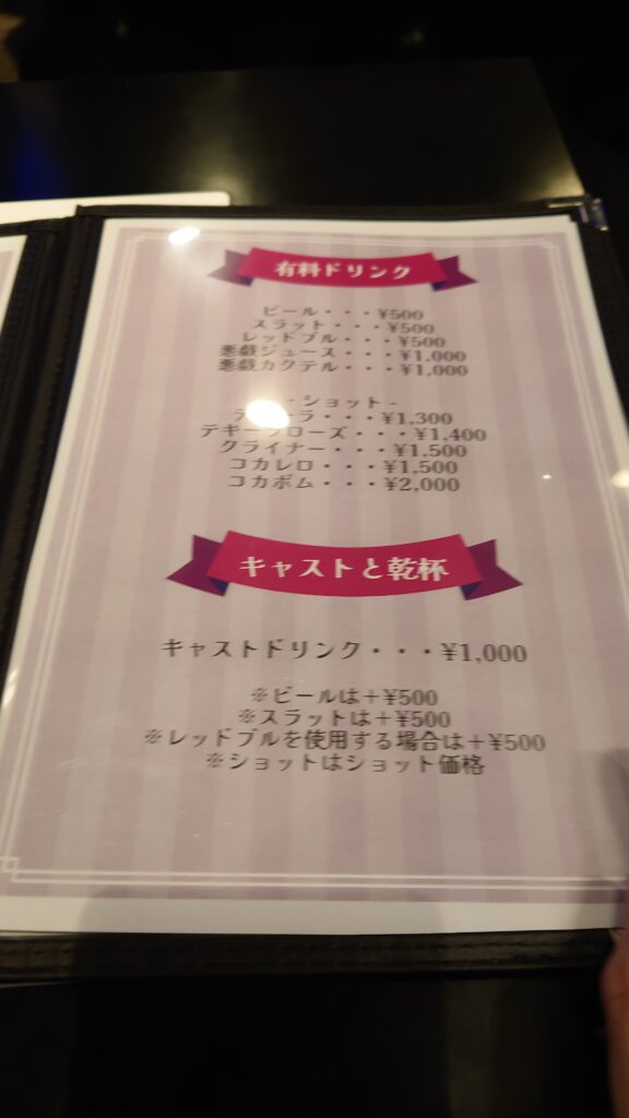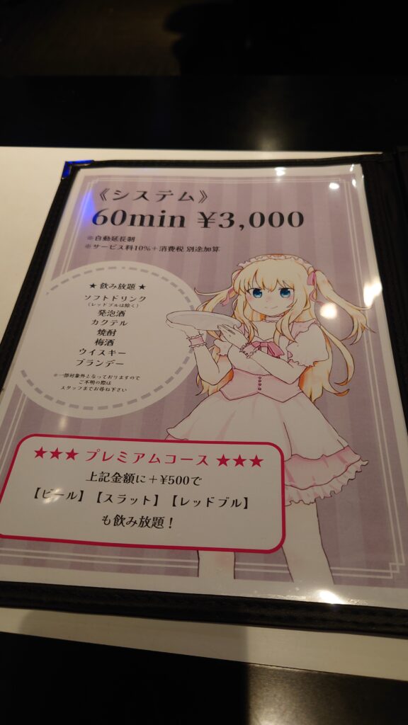 初来店の場合はシステム説明があり、その後ドリンク注文。