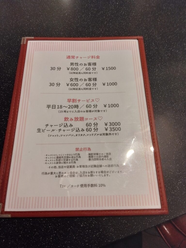 キャストさんに席に案内され、店内利用の説明を聞きます。