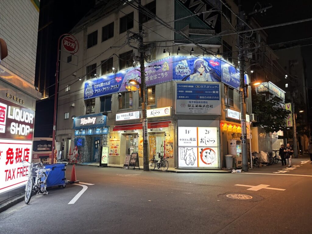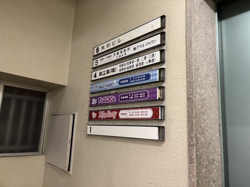 ⑤直進すると、Alice×Aliceの看板が見えます。このビルの2階がTeALICeです。