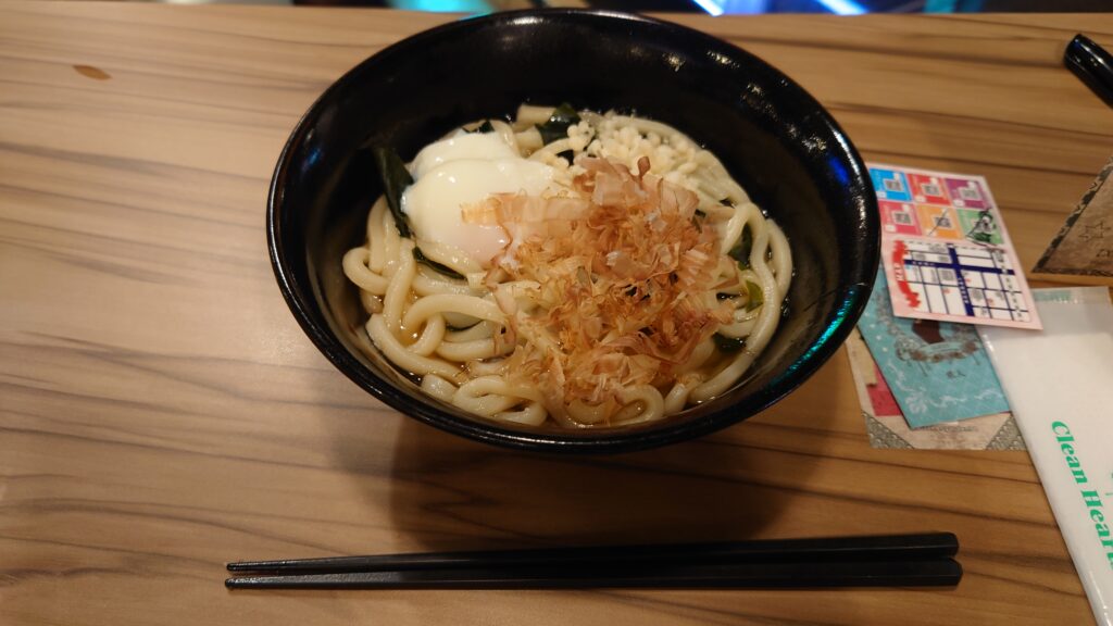筆者はソフトドリンクと玉うどんを注文。この時、ちょうど食事をする時間に来店したため、ここで食事を済ませました。