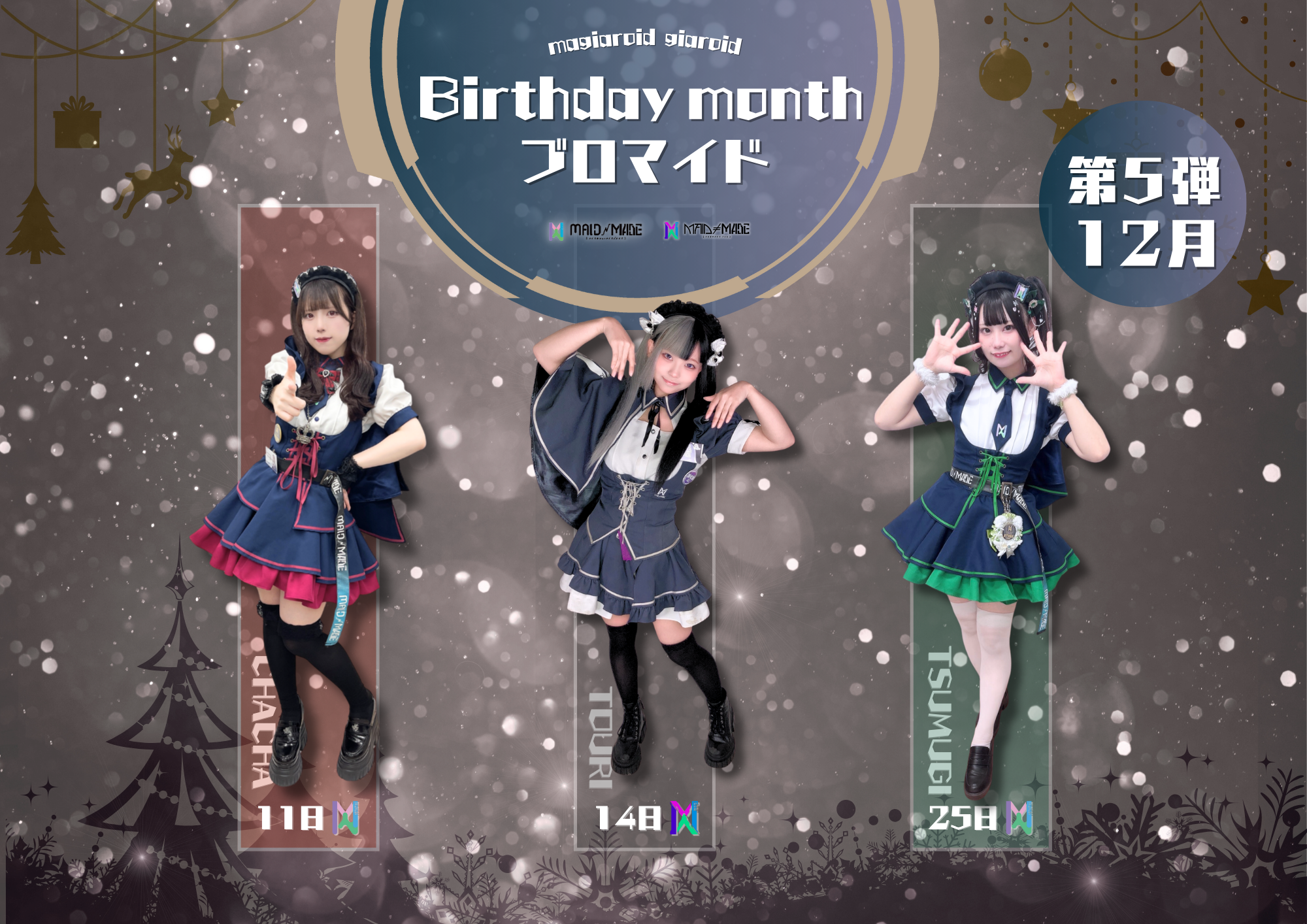 MAID≠MADE not MAID√MADE 合同企画バースデーブロマイド第5弾が発売!バースデーブロマイド企画も今月でラストとなりました!このバースデーブロマイドは、誕生月のメイドさんをピックアップ!スペシャルなデコレーション&メッセージ(複製)でデザインされ、その月限定で常時販売されます!全身が映る立ち姿verと、かわいい表情がアップになったバストアップverの2種類1セット¥1,100(税込¥1,210)!是非ゲットしてメイドさんの記念日を彩りましょう🤍ラスト第5段として12月1日〜12月31日に販売されるのは...??❤️ MAID√MADE 名古屋大須本店ちゃちゃ(12月11日生まれ)👻 MAID≠MADE not 名古屋大須店透(12月14日生まれ)🌱 MAID√MADE 秋葉原駅前店つむぎ(12月25日生まれ)以上3名の12月生まれのギアロイド&マギアロイド達でお送りします🤍また、好評いただいグループ全体企画のバースデーブロマイドは今月でラストとなります😭今まで応援してくれてありがとうございました👏👏・・・・2026年からは新しい企画が始まる予感?!