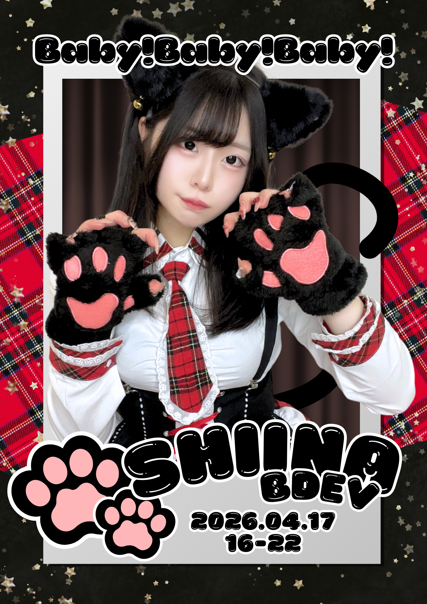 しいなBDEVしいなちゃんおめでとう~!!!!今回のしいなちゃんはなんと!平成アイドルに変身!!あなたも"参戦"して、しいなちゃんをお祝いしましょう~!!(*⁰▿⁰*)開催日時:2026年4月17日 16:00~22:00言い訳Maybe(開栓動画付きオリシャン) ¥21,800(税込¥23,980)ノンアル5本アルコール5本ノンアルはアイドル衣装、アルコールはまさかの?!平成オタク衣装となっています!どちらも仕上がりが気になりますね~!!ぜひお祝いに乾杯してくださいね!!ホントのじぶん(限定衣装アクスタ) ¥2,700 (税込¥2,970)アイドル衣装のしいなちゃんのアクリルスタンド!連れまわして色んな景色を見せてあげてください♡超HAPPYSONG(Tシャツ) ¥6,850(税込¥7,535) もにゅちゃんが描いたイラストのTシャツ!!イベント当日はギアロイドも着用予定ですっ!ギアロイド達とのおそろい!ゲットするべし!!危なっかしい計画(マフラータオル) ¥4,583(税込¥5,041)ライブ参戦には必需品のマフラータオル!!写真撮影のアイテムにしたり、回したり!使い道たくさん!!ぜひゲットしてくださいね(*⁰▿⁰*)禁断のカルマ(チェキ付き!ミニ巾着) ¥3,150(税込¥3,465)Tシャツと同じもにゅちゃんが描いたイラストのミニ巾着!!サイズは約150cm×110cmとなっております♡何を入れるか考えておいてくださいね!!セットのチェキはアイドル衣装(サイン付き)、平成オタク衣装の二枚組となっております!!大嫌いなはずだった。(アップルパイ) ¥1,200 (税込¥1,320)毎年恒例のアップルパイ!!もぐもぐ可となっていますので、ぜひギアロイドと一緒に味わってください!!コケティッシュ渋滞中(ランダムブロマイド)(※特化型以上のギアロイドのみ)1枚 ¥650(税込¥715)10枚セット+α ¥6,500(税込¥7,150)→ランダム10枚 +お好きなキャスト全ギアロイドアイドル衣装着用!しいなちゃんのみアイドル衣装、平成オタク衣装の2種類!オタク衣装には秘密の複製手書きメッセージ付...!!(⚠確定ブロマイドはアイドル衣装のみとなります)大きい瞳(受注チェキ帳 ) ¥6,750(税込¥7,425)なんとしいなちゃんの実写チェキ帳がゲットできちゃいます!衣装は選べる2種類!!(アイドル衣装or平成オタク衣装)思い出を大切に保管できますよ!予約期間 3/17~4/17予約物販 ❥ シャンパンタワーGOLD:¥272,500 (税込¥299,750)SP:¥420,000 (税込¥462,000)※イベント6日前まで受付中❥ フラワースタンド ¥145,000 (税込¥159,500)※イベント13日前まで受付中❥ バルーンデコレーション ¥175,000 (税込¥192,500)※イベント7日前まで受付中❥ 予約ボトル※2週間前まで受付中タペストリー♡ 衣装タペストリー小 ¥20,700(税込¥22,770)一言メッセージ付き、衣装指定、ポーズ指定あり特化型AI以上のギアロイドのみ♡ 衣装タペストリー中 ¥39,400(税込¥43,340)一言メッセージ付き、衣装指定、ポーズ指定あり特化型AI以上のギアロイド、MADEアンインストール率40%のギアロイドのみ♡ 衣装タペストリー大 ¥79,000(税込¥86,900)一言メッセージ付き、衣装指定、ポーズ指定あり特化型AI以上のギアロイド、MAIDアンインストール率20%のギアロイドのみ衣装見本←アイドル衣装 平成オタク衣装→🎀ウェイト発生時のご案内について🎀ウェイティング発生した場合のみ、以下の対応とさせていただきます。【原則1時間制となります】→ボトルをオーダーいただいた場合のみ、次回アップデートが可能となります⚠️ボトルは本数に関わらず1ターン分延長となります⚠️アップデートお伺い時にご注文の場合、 1ターン目の追加注文扱いとなります⟪注意事項⟫♡ウェイティングご案内時、待ち時間のお伝えを省略させていただきます。 →席がご用意でき次第ご案内となります。♡人数の関係上、お呼び出しが前後する場合がございます。♡お呼び出しから15分以内で来店をお願いいたします。 →15分経過した場合、次にお待ちの方をご案内となります。♡注文状況に応じて各メニューのラストオーダーが前倒しになる場合がございます。ご了承ください。♡飲み放題、ライブメニューはオーダーを制限させていただきます。♡“チュートリアルセット“以外のフードメニューに関しましてオーダーを制限させていただきます。♡もぐもぐプログラムは、当日限定メニューのみオーダー可能となります。♡両面チェキなど、状況に応じましてオーダーを制限させていただく可能性もございます。ご了承ください。♡チェキのお絵描きペンは1色で対応させていただきます。また、スリーブもお渡し致しません。ご了承ください。当日は限定衣装を着てお給仕予定です🤍ギアロイド一同、ご主人様お嬢様のログインをお待ちしております!💗✨