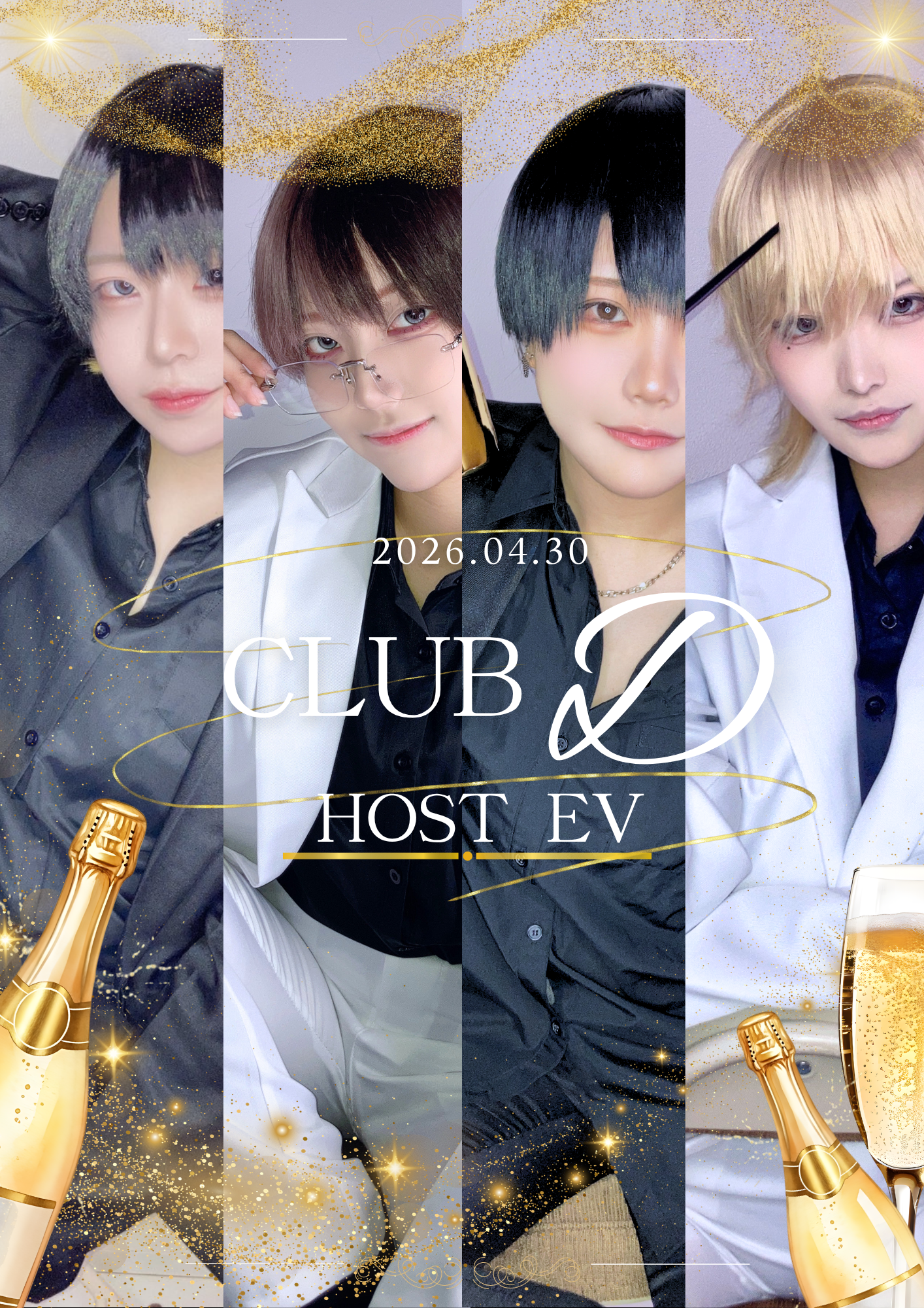 ホストEV姫、おかえり―――…未来の人気店、「clubD」から4人の人気ホストが出張営業。さぁ、あなたも"姫"になって、かっこよくて可愛いホストに堕落しちゃいましょう開催日時:2026年4月30日 16:00~22:00オリシャン(開栓動画、確定ブロマイド付き) ¥22,500(税込¥24,750)ノンアルコールの健全シャンパンです。数量限定。ぜひ開栓してホストたちとの素敵な思い出を残しちゃいましょう。飲みゲー⁉テキーラ観覧車 ¥1,850(税込¥2,035)お絵かきなしチェキ付きテキーラ観覧車!!(※ノンアルコールです)そしてなんと…!?ギアロイドとの飲みゲー付き!!!!!負けたらイッキ!勝ったらくじに参加できます![くじ内容]・写メ券・開栓動画券・10秒動画券・ホスト4人のランダムブロマイド・黒フィルムチェキ券🎀ウェイト発生時のご案内について🎀ウェイティング発生した場合のみ、以下の対応とさせていただきます。【原則1時間制となります】→ボトルをオーダーいただいた場合のみ、次回アップデートが可能となります⚠️ボトルは本数に関わらず1ターン分延長となります⚠️アップデートお伺い時にご注文の場合、 1ターン目の追加注文扱いとなります⟪注意事項⟫♡ウェイティングご案内時、待ち時間のお伝えを省略させていただきます。 →席がご用意でき次第ご案内となります。♡人数の関係上、お呼び出しが前後する場合がございます。♡お呼び出しから15分以内で来店をお願いいたします。 →15分経過した場合、次にお待ちの方をご案内となります。♡注文状況に応じて各メニューのラストオーダーが前倒しになる場合がございます。ご了承ください。♡飲み放題、ライブメニューはオーダーを制限させていただきます。♡“チュートリアルセット“以外のフードメニューに関しましてオーダーを制限させていただきます。♡もぐもぐプログラムは、当日限定メニューのみオーダー可能となります。♡両面チェキなど、状況に応じましてオーダーを制限させていただく可能性もございます。ご了承ください。♡チェキのお絵描きペンは1色で対応させていただきます。また、スリーブもお渡し致しません。ご了承ください。当日はホスト4人以外も限定衣装を着てお給仕予定ですギアロイド…いや…clubD 一同、ご主人様お嬢様のログインをお待ちしております!✨