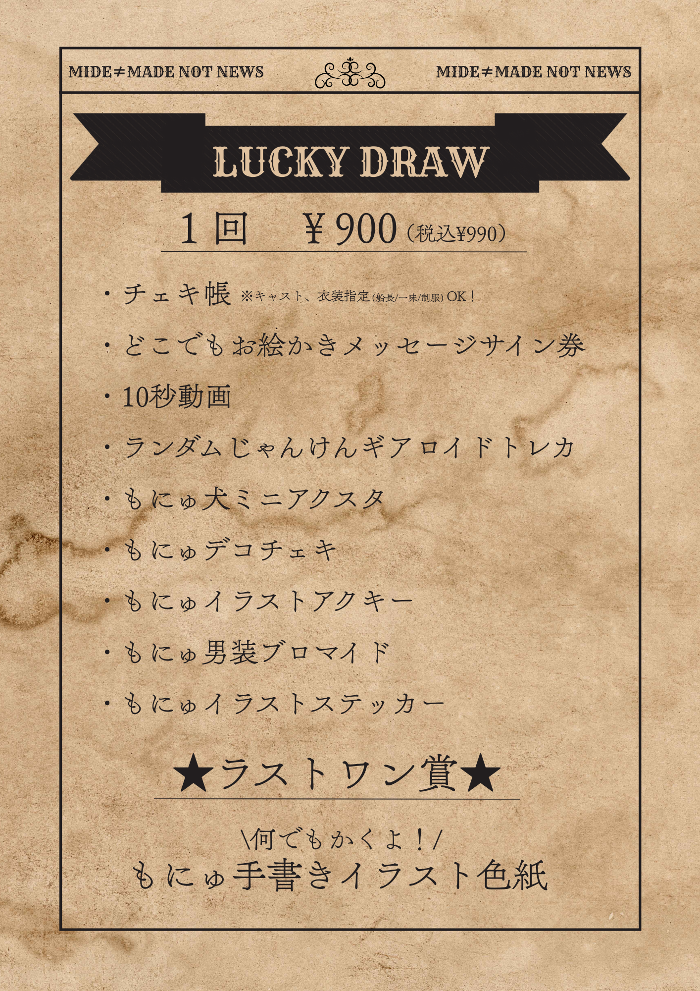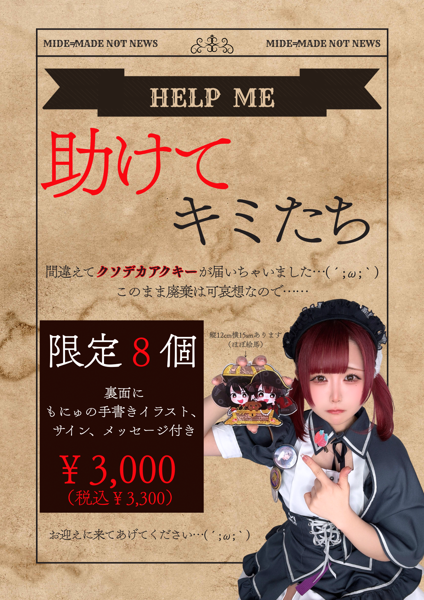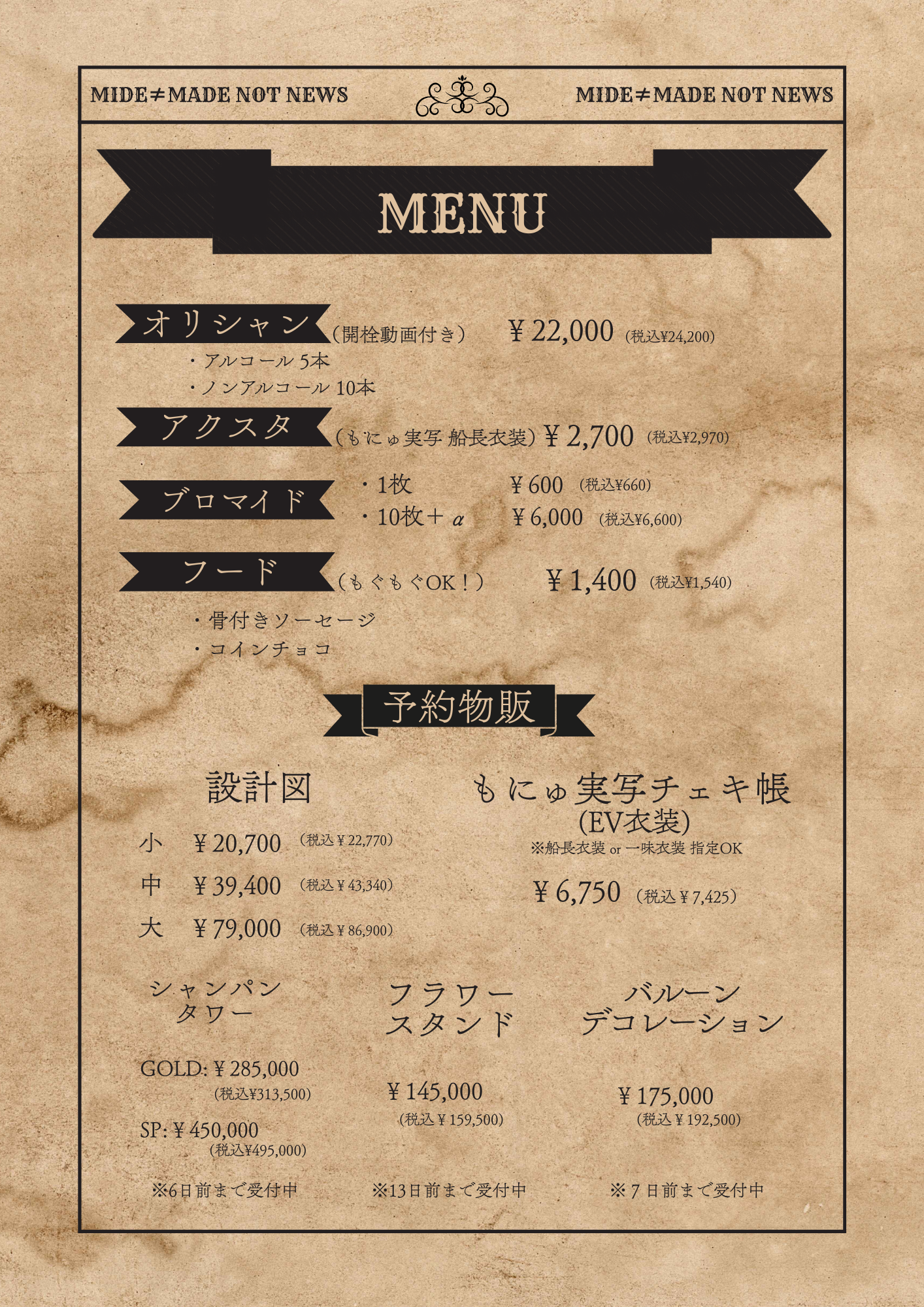 まもなかBDEVまもなかちゃんおめでとう~!!!!今回は古城で秘密のお誕生日会が開かれるようですね...ギアロイド達も古城でお誕生日会のお手伝いをしてくれています!まもなかちゃんをみんなでお祝いしましょう~!開催日時:2026年3月25日 16:00~22:00大人の義務(オリシャン) ¥21,800(税込¥23,980)ノンアル10本アルコール5本両方とも実写です!どちらもかわいいのでほしくなっちゃいますよね~!ぜひお祝いに乾杯してくださいね!!プリチー(限定衣装アクスタ) ¥2,700 (税込¥2,970)限定衣装のまもなかちゃんのアクリルスタンド!連れまわして色んな景色を見せてあげてください♡夢遊(パンケーキ) ¥1,500 (税込¥1,650)インスタントフォト風カード付になります!まもなかちゃんの大好きなパンケーキ♡インスタントフォト風カードは実写のものになっています!しかも、箔押し仕様で超豪華!!!いちかばちかちゃん(※特化型以上のギアロイドのみ)1枚 ¥600(税込¥660)10枚セット+α ¥6,000(税込¥6,600)→ランダム10枚 +お好きなキャスト1枚確定!限定衣装のかわい~いブロマイド!ぜひゲットしてください!you&i ¥6,750(税込¥7,425)なんとまもなかちゃんの実写チェキ帳がゲットできちゃいます!衣装は2種類(限定衣装or制服)から選べます!思い出を大切に保管できますよ!LOVE&YEN 1回 ¥1,000 (税込¥1,100)※1人1ターン10回まで詳細↓予約物販 ❥ シャンパンタワーGOLD:¥272,500 (税込¥299,750)SP:¥420,000 (税込¥462,000)※イベント6日前まで受付中❥ フラワースタンド ¥145,000 (税込¥159,500)※イベント13日前まで受付中❥ バルーンデコレーション ¥175,000 (税込¥192,500)※イベント7日前まで受付中❥ 予約ボトル20万以上のボトルを予約してくれた方にはれあちゃんからのメッセージカード付き❣️※2週間前まで受付中タペストリー♡ 衣装タペストリー小 ¥20,700(税込¥22,770)一言メッセージ付き、衣装指定、ポーズ指定あり特化型AI以上のギアロイドのみ♡ 衣装タペストリー中 ¥39,400(税込¥43,340)一言メッセージ付き、衣装指定、ポーズ指定あり特化型AI以上のギアロイド、MADEアンインストール率40%のギアロイドのみ♡ 衣装タペストリー大 ¥79,000(税込¥86,900)一言メッセージ付き、衣装指定、ポーズ指定あり特化型AI以上のギアロイド、MAIDアンインストール率20%のギアロイドのみ୨୧・・・・・・・・・・・・・・・・・・・・・・・・・୨୧