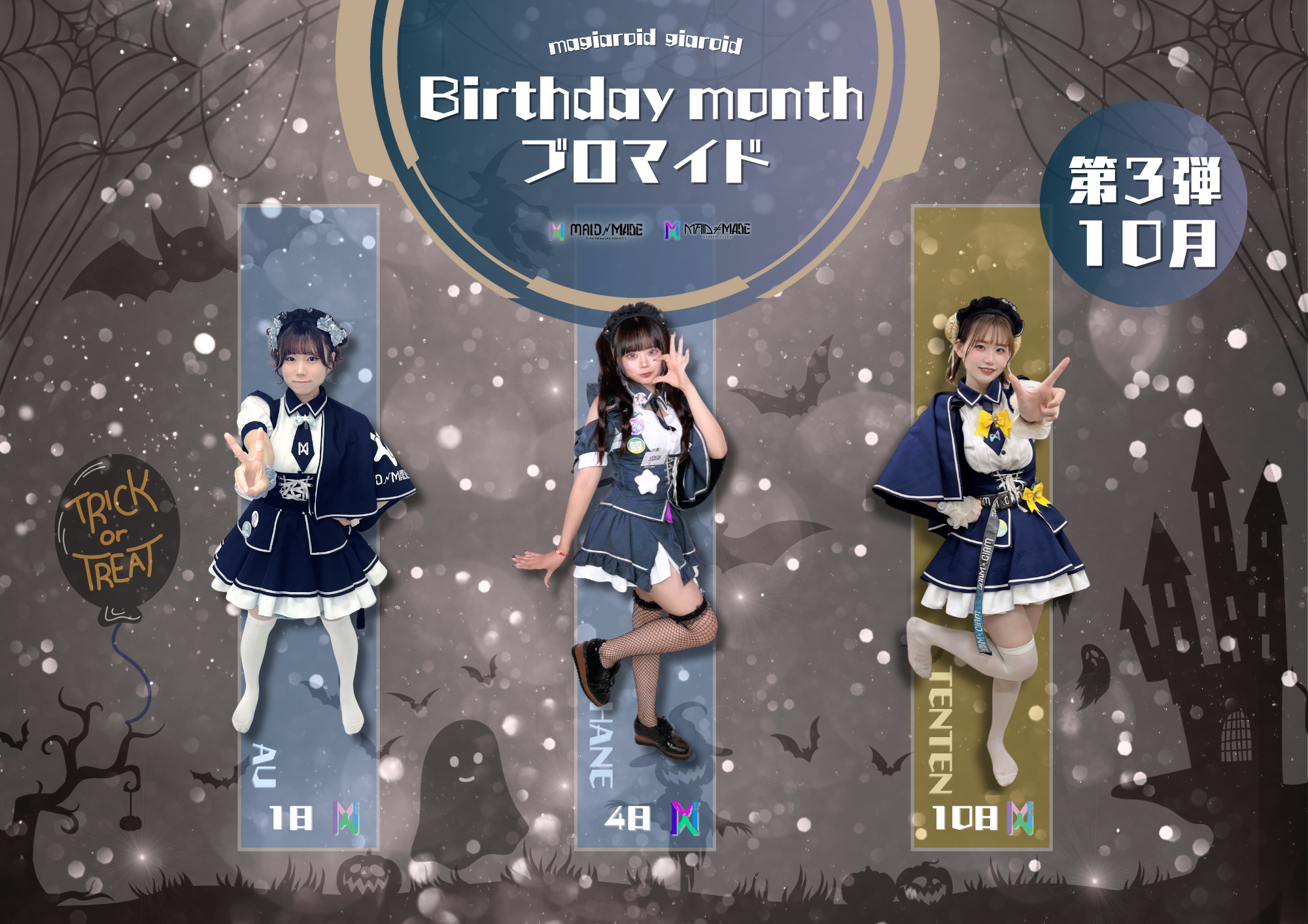 MAID≠MADE not MAID√MADE合同企画バースデーブロマイド第3弾が発売決定!先月好評だったバースデーブロマイド企画が今月も登場!このバースデーブロマイドは、誕生月のメイドさんをピックアップ!スペシャルなデコレーション&メッセージ(複製)でデザインされ、その月限定で常時販売されます!全身が映る立ち姿verと、かわいい表情がアップになったバストアップverの2種類1セット¥1,100(税込¥1,210)!是非ゲットしてメイドさんの記念日を彩りましょう🤍第3段として10月1日〜10月31日に販売されるのは...??🌧️MAID√MADE 秋葉原駅前店あう(10月1日生まれ)🪽MAID≠MADE not 名古屋大須店はね(10月4日生まれ)🥟MAID√MADE 名古屋大須本店てんてん(10月10日生まれ)以上3名の10月生まれのギアロイド&マギアロイド達でお送りします🤍
