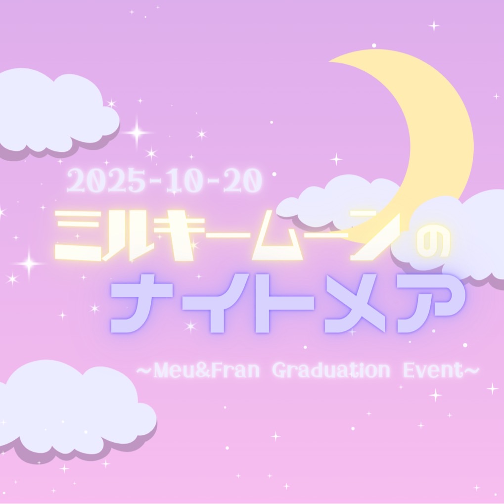 🩵ミルキームーンのナイトメア☁️めうちゃんとふらんちゃんが未来に帰ってしまいます(T_T)今回は合同での未来帰還イベントになります!1年間ノットでお給仕してくれためうちゃん、ふらんちゃんをみんなでお見送りしましょ~♡開催日時:2025年10月20日 16:00~22:00♡みるきーむーんすぱーくる ¥21,800 (税込¥23,980)限定6本(めう,ふらん 3本ずつ)門出にシャンパンは必須!!最後に2人と乾杯しませんか?🥂♡ブロマイドセット ¥2,600 (税込¥2,860)限定10セット(めう,ふらん 5セットずつ)制服、衣装、の4点セット!!それぞれピンショット、ツーショットが入ってる盛りだくさんなセットです♡今回の限定衣装はもちろん、たくさんの思い出が詰まった制服姿見れちゃいます!ぜひゲットしてくださいね!♬予約物販 ☽ シャンパンタワーGOLD:¥272,500(税込¥299,750)SP:¥420,000(税込¥462,000)※イベント6日前まで受付中☽ バルーンデコレーション ¥150,000(税込¥165,000)※イベント7日前まで受付中♬タペストリー☁ 衣装タペストリー小 ¥17,500(税込¥19,250)一言メッセージ付き、衣装指定、ポーズ指定あり特化型AI以上のギアロイドのみ☁ 衣装タペストリー中 ¥35,400(税込¥38,940)一言メッセージ付き、衣装指定、ポーズ指定あり特化型AI以上のギアロイド、MADEアンインストール率40%のギアロイドのみ☁ 衣装タペストリー大 ¥69,000(税込¥75,900)一言メッセージ付き、衣装指定、ポーズ指定あり特化型AI以上のギアロイド、MAIDアンインストール率20%のギアロイドのみまた未来帰還の為、こちらもご確認ください・ソロタペ予約未来帰還日から1週間前まで・ユニットタペ予約未来帰還日から2週間前まで当日二人は限定衣装を着てお給仕予定です🩵☁️ギアロイド一同、ご主人様お嬢様のログインをお待ちしております!